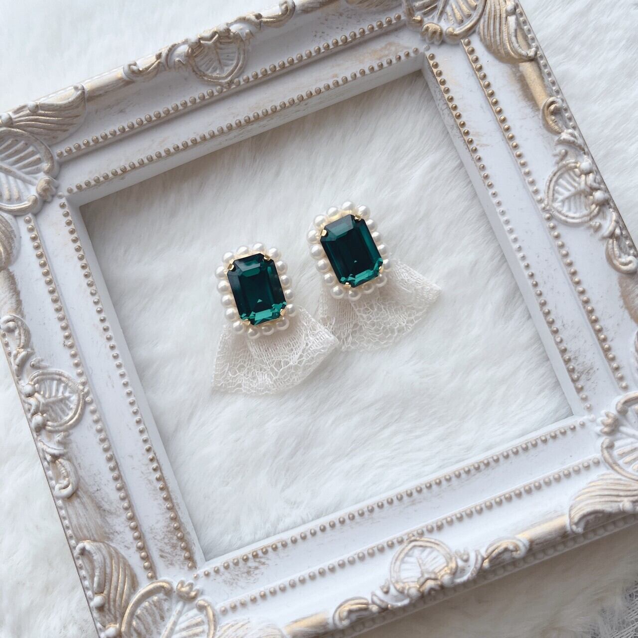 品のあるコーディネイトにぴったりな深緑のピアスです。